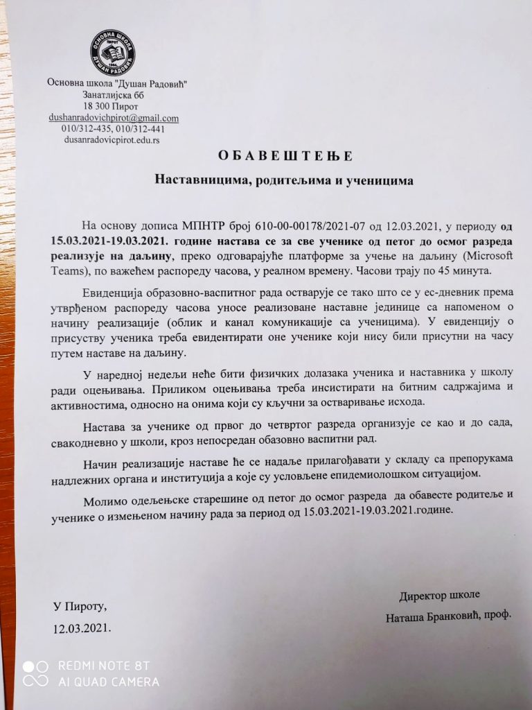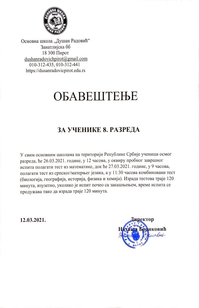 Обавештавамо Вас да ће се упис деце у први разред основне школе, за школску 2021/2022. годину обавити у периоду од 01.04.2021. до 31.05.2021. године.
